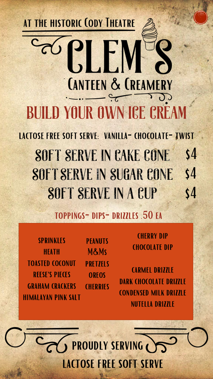 During the summers, Clem’s Canteen & Creamery is open every Wild West Spectacular Show day: 11:00 am - 9:30 pm in our lobby for dine in OR carry out. Offering lactose free soft serve with choice of toppings, specialty grilled cheese & smoked pulled pork sandwiches, Hawks Hill wagyu and Hebrew Nation hotdogs, popcorn, candy, soda, tea, lemonade and select canned beers, wine, champagne, and hard seltzers. Wild West Spectacular ticket holders can also bring any of these items into the theatre to enjoy while watching the performance (ice cream menu is different for shows).